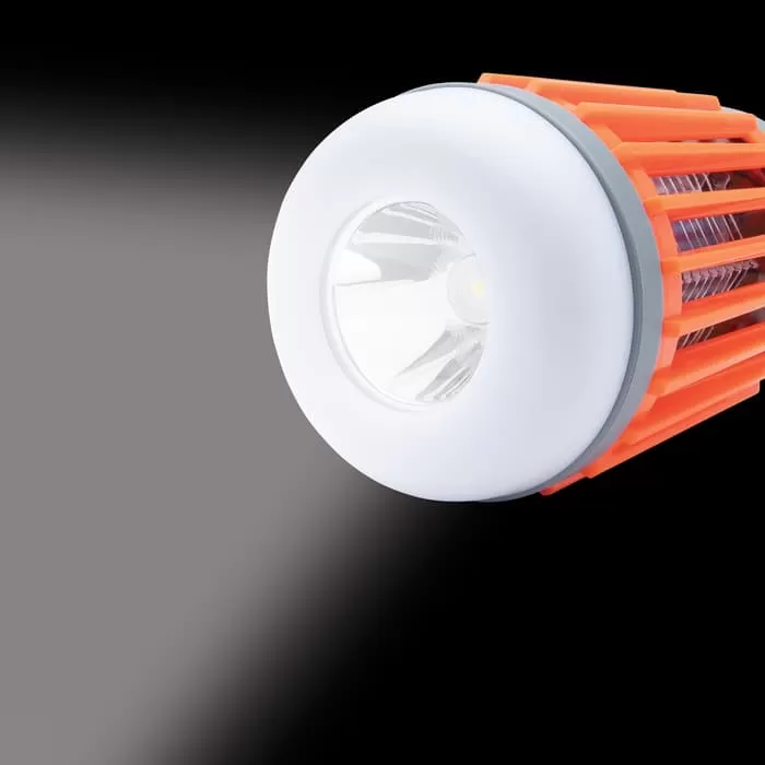 The Trailblazer Camp Lantern and Bug Zapper is an all-purpose light with five modes of operation including lantern, low flashlight, high flashlight, SOS and bug zapper. It has a water-resistant, orange ABS construction with a metal hanger on top and two rubberized activation buttons. The multi-light has COB lights for the lantern, a 180-lumen LED flashlight with a 150-meter range and a UV bug zapper light. It will run 20 hours on low-light, 12 to 15 hours on high-light and the bug zapper will run for 12 to 15 hours. Itβs powered by a rechargeable battery that can be charged either by the solar panel on top or the USB port (cord included). The tough, all-purpose camp light and bug zapperβs dimensions are 5 1/2β tall with a 3β base.