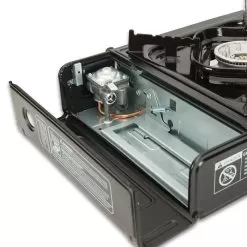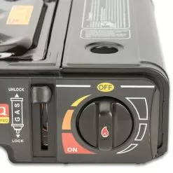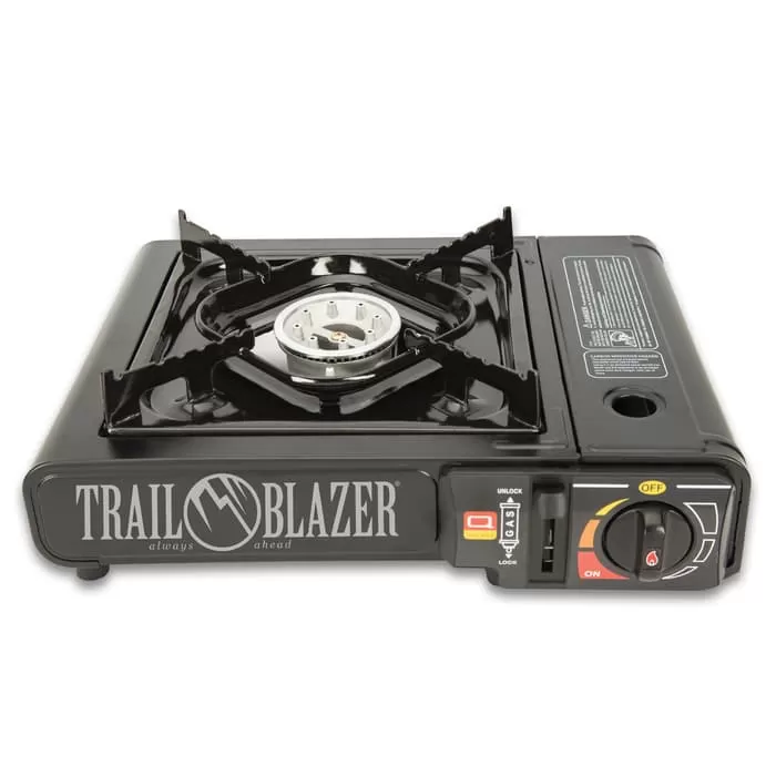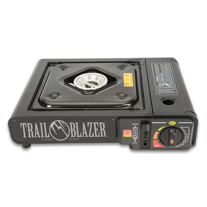The Trailblazer Portable Camping Stove is a portable and convenient, single burner stove that works great for camping, catering, BBQβs, and other off-site cooking. The propane stove has a rugged steel body that can withstand high temperatures, making it ideal for campsite cooking and it has a convenient storage compartment for an 8 oz butane canister (not included). The large base offers stability for easy stirring and cooking and the burner fits up to a 10β pot or pan, plus, it has an enamel-coated drip tray. The stoveβs adjustable control valve gives you precise temperature control offering up to 8,000 BTUs, from one butane canister, for two to four hours. The piezo ignition allows for quick and easy match-free lighting and heats up quickly and efficiently with even heat distribution. It fits neatly in a hard plastic carrying case for storage and travel. The overall height of the stove, from top to bottom, is 4 1/2β; the overall width, from side to side, is 13 1/2β and the overall depth, from front to back, is 11β.