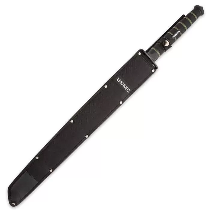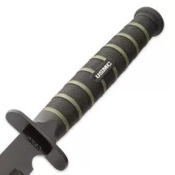 Expertly fusing tradition and innovation, the officially licensed USMC “Blackout” Combat Sword is an undeniably modern take on an iconic, time-tested USMC sword design. Its potent 19 3/4″ AUS-6 stainless steel tanto blade features the classic nonreflective black coating, enlarged blood groove, partial serrations and prominent “USMC” stamp that old-school Marine combat sword fans know and love. It’s a tried-and-true blade design that continues to prove its worth on the battlefields and in the back country wildlands of the present day. Beyond the blade, the Blackout Sword’s handle is encircled by five green bands – an aesthetic nod to the classic combat sword’s emblematic stacked leather handle. But the familiarity largely ends here – with respect to the handle, at least. Retooled to satisfy the unique tactical demands and survival challenges of the modern era, the Blackout Sword’s advanced injection molded handle is extraordinarily durable and boasts a textured rubberized grip that virtually eliminates slippage, even in wet environments and other harsh conditions. A “USMC” inset is positioned in the handle’s center, reminding all who see it that the Blackout Combat Sword is engineered to be Marine tough. Set atop the pommel is a convenient steel glass breaker – another contemporary addition that’s perfect for escaping (or assisting others in escaping) entrapment in a wrecked vehicle or burning building, where glass windows may be the only means of exit. Add the included heavy duty black nylon sheath, and you’ve got an extraordinary tanto sword setup that honors traditional wisdom, while taking full advantage of the latest and greatest innovations. And since it’s officially licensed by the United States Marine Corps, you can rest assured the USMC Blackout Combat Sword is in it for the long haul!