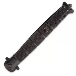 An undeniably modern take on a classic folding knife design, the officially licensed USMC “Blackout” Stiletto combines all the wicked ferocity of the iconic stiletto with contemporary tactical appointments and styling. And this impressively supersized “Colossal” version packs even more punch than the original USMC Blackout Combat Stiletto, with its menacingly enlarged blade and beefed up overall dimensions! Its potent 5″ 420 stainless steel blade features the sleek spear point profile that old-school stiletto fans know and love and adds a distinctive blood groove and bold nonreflective black coating. Beautifully offsetting the blade’s matte black finish, the famous USMC seal is carefully laser etched in white next to the razor sharp edge, flanked by the branch’s illustrious, well-earned slogan – “Marines: The Few. The Proud.” The chic blade deploys with incredible speed, thanks to the Colossal Blackout Stiletto’s silky smooth assisted opening mechanism – easily triggered with the handy flipper. Cast from an advanced aluminum alloy, the handle is encircled by five green bands – an aesthetic nod to the historic USMC combat fighter knife and its legendary stacked leather handle. Engineered to satisfy the unique tactical demands and survival challenges of the modern era, the Colossal Blackout Stiletto’s handle is extraordinarily durable yet lightweight, boasting an elegant diamond gun stock texture that virtually eliminates slippage, even in wet, muddy environments and other harsh conditions. “USMC” is laser etched at the handle’s center, reminding all who see it that the Colossal Blackout Stiletto is built “Marine tough.” Set at the base of the handle is a convenient steel glass breaker – another contemporary feature that’s perfect for escaping (or assisting others in escaping) entrapment in a wrecked vehicle or burning building, where glass windows are the only means of exit. Add the built-in steel pocket clip, and you’ve got an outstanding, extra-large assisted opening folder that honors traditional wisdom, while taking full advantage of the latest and greatest innovations. And since it’s officially licensed by the United States Marine Corps, you can rest assured the USMC Colossal Blackout Stiletto is in it for the long haul – a stout pocket knife you can rely on, come what may, just like a US Marine.