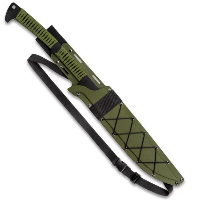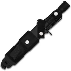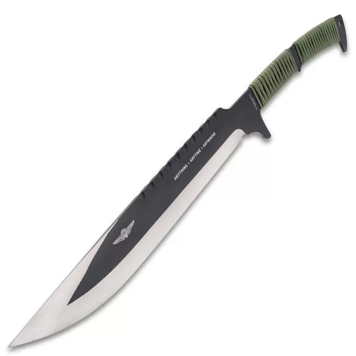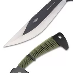 The officially licensed Tak-Kana Sword from USMC melds modern tactical innovation with traditional Samurai design to produce a bladed weapon ready for todayβs battlefields. It has a solid, one-piece 3Cr13 stainless steel construction with a black-coated and stone washed finish and a 14 5/8β blade. The blade is laser-etched with the words, βAnything. Anytime. Anywhere.β The handle is wrapped Samurai style in faux black rayskin and olive drab nylon cord and it has a lanyard hole in the pommel. The 29 1/2β overall sword fits securely in a molded polypropylene scabbard, which has black wrapped paracord, lashing slots and an adjustable shoulder strap.