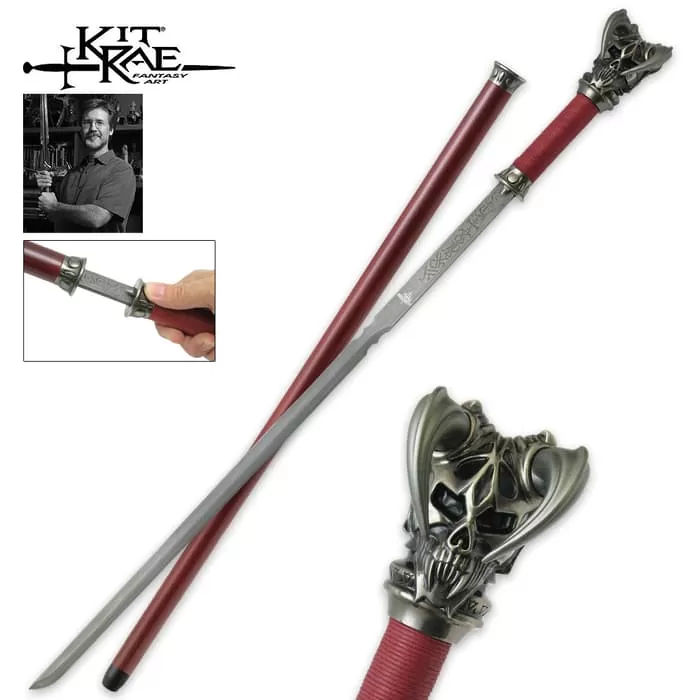 A fully functional sword cane version of the popular Vorthelok sword from the “Swords of the Ancients” collection, you have to have this new Kit Rae design. The pommel is wrought in the horned skull image of Evruc, and the blade is engraved with Anglecal runes that translate to βOut of Darkness Comes Light.β The cast metal shape and style of the handle offers a sure, confident and comfortable hold with its dark red, waxed cotton cord-wrapped grip. The 26″ folded Damascus blade locks securely into the wooden cane shaft. The blade unlocks with a push of a button, hidden in the cast metal fitting. Measures 36 3/4″ overall length.