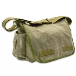 Carry all that you need for your daily activities or when you travel in our Washed Olive Drab Messenger Bag. Made of 100 percent cotton canvas in washed olive drab, the bag is as tough as nails so that it will stand-up to hard-use. It has one large, main compartment with an inner, zippered pocket for smaller gear. On the outside are two larger pockets that are covered by the main compartment’s, large flap and secured with Velcro. On each side of the messenger bag are pockets secured with metal snaps. The bag can be carried by its tough, nylon webbing shoulder strap. The bag’s dimensions are approximately 15 1/2”x 20 1/2”.