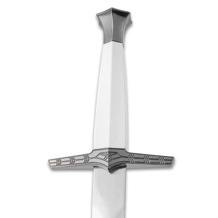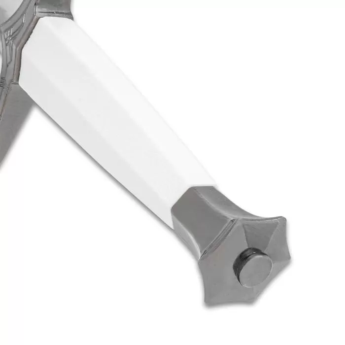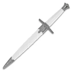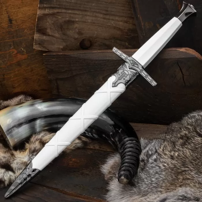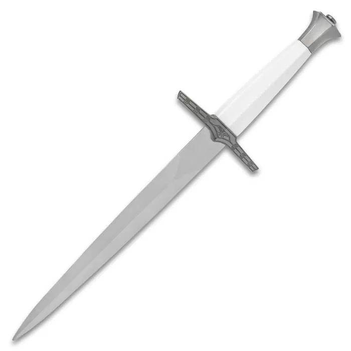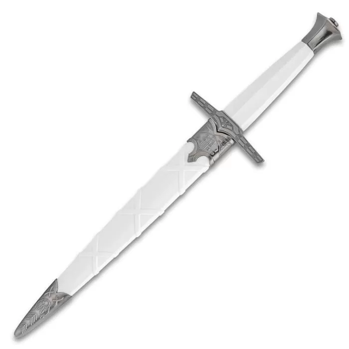A great display piece for your home or office, the Witching White Short Sword was inspired by popular fantasy seriesβ and books. It has a mirror-polished blade that extends from a pewter-colored, cast metal crossguard. The beveled handle has a textured white grip and a pewter-colored, cast metal, crown-style pommel. The short sword comes with a matching ornate white scabbard.