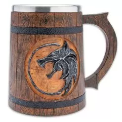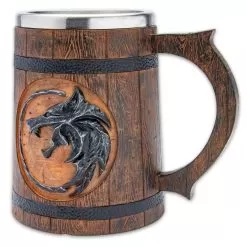 Incredible attention to detail makes the Wolf Medallion Mug an exceptional piece to add to your home dΓ©cor or bar. Crafted in cold cast resin, it looks exactly like real wooden slats, banded together with real-looking iron bands. It truly is a master-piece of design even without its wolf decoration on each side. The circular wolf design looks like itβs a growling wolf head in profile, made out of actual iron that has been inset into the wood. All of it, though, is crafted in resin. A stainless steel liner insulates your beverage, keeping it either hot or cold.